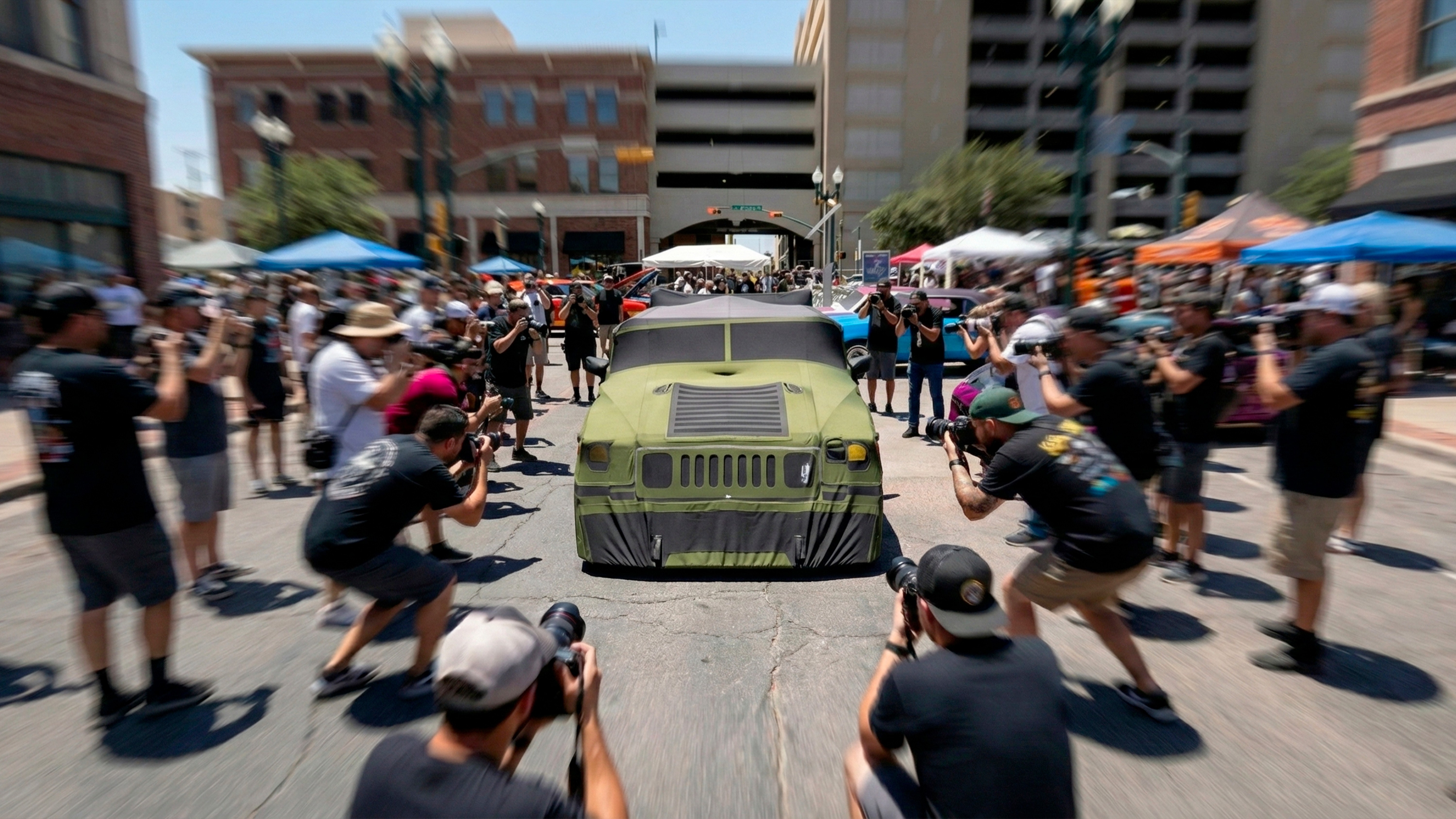 The covered car creates mystery. The crowd implies importance. The motion blur adds energy.