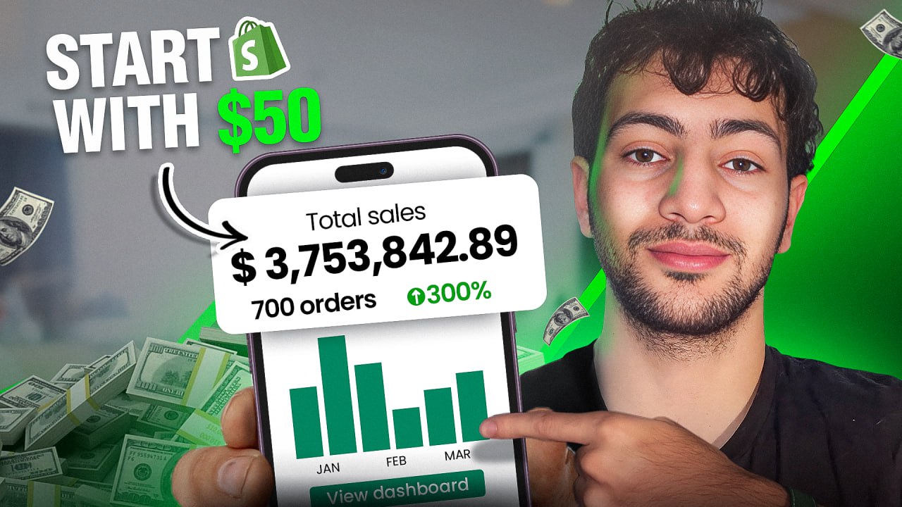 A results-driven thumbnail showing a $3M dashboard with “Start with $50,” using money cues and a green growth graph to make the outcome feel tangible.