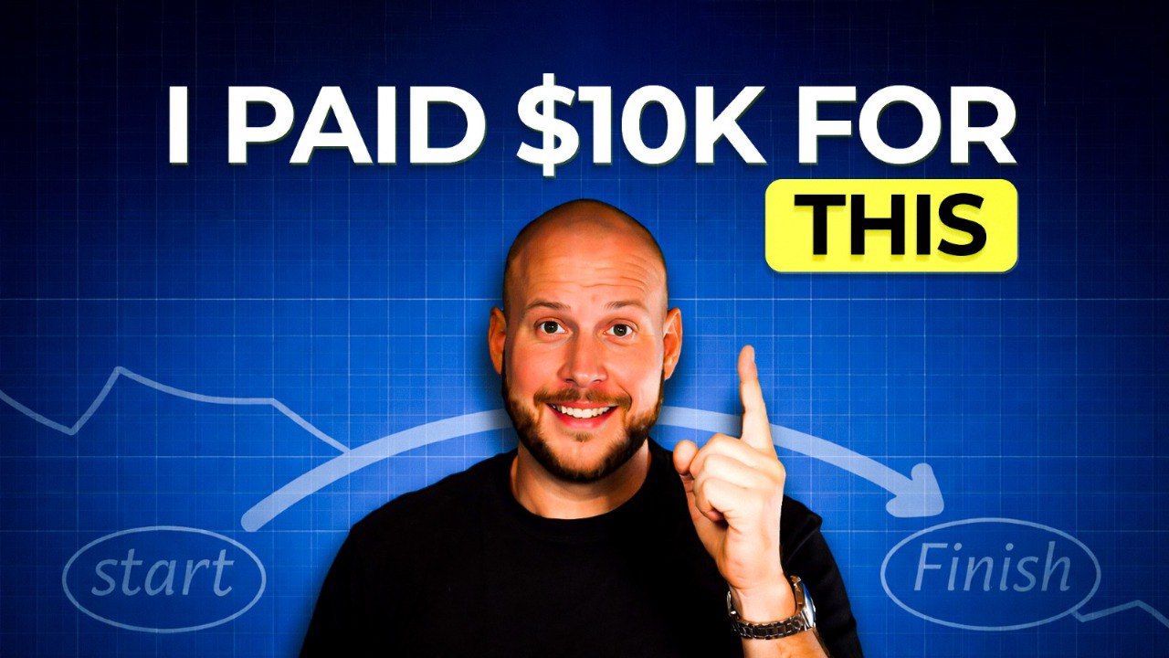 A curiosity-driven thumbnail featuring the creator pointing to “I paid $10k for this,” using a grid background and progress arrow to signal a valuable system and transformation.